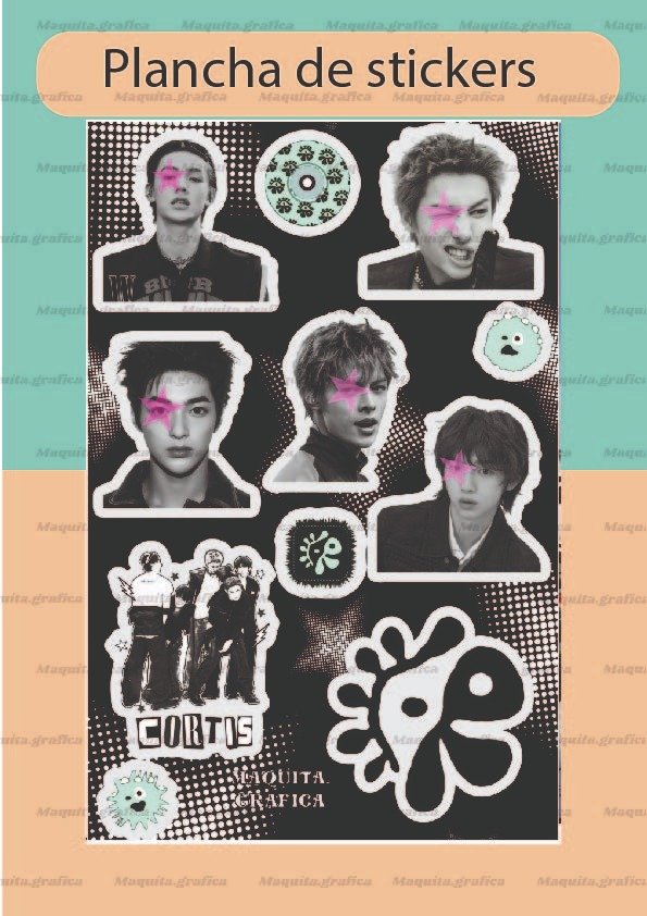 Plancha de tamaño A5 con stickers de entre 5 a 6 cm.