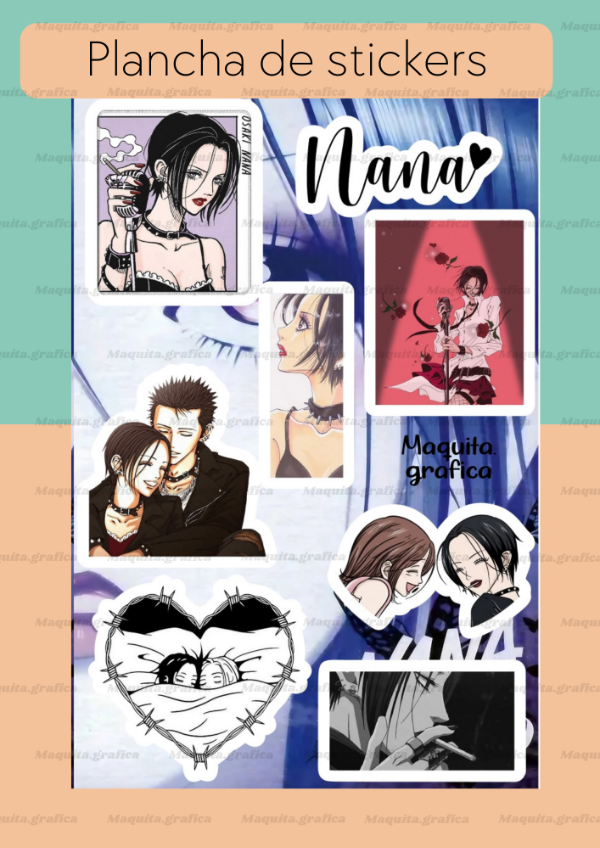 Plancha de tamaño A5 con stickers de entre 5 a 6 cm.