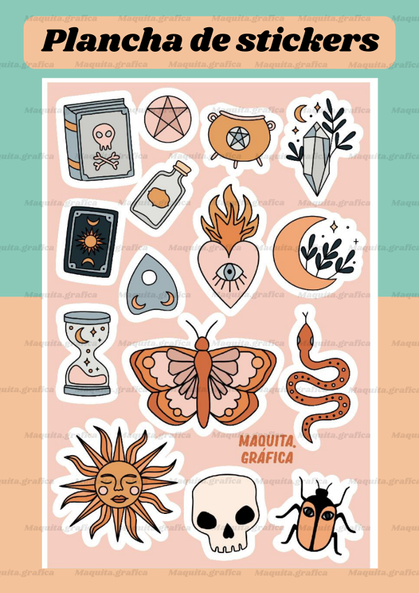 Plancha de tamaño A5 con 9/10 stickers de entre 5 a 6 cm.
